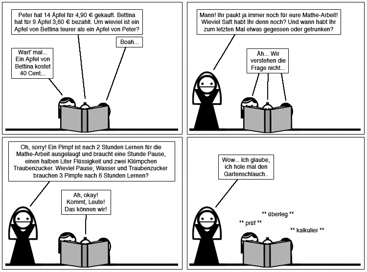 - When you've spent a long time staring at a question and are thoroughly fed up of it, it can be a good idea to try something else, whether it be another question, a domestic chore, a walk outside, or a tea break. Sometimes you will find that a new and useful idea will come to you with a change to focus or scene. The fact that you have found a solution whilst operating a kettle which eluded you when staring at a page densely covered with scribblings doesn't mean that the time spent scribbling was wasted. On the contrary, it created the state of mind in which a flash of inspiration was possible.